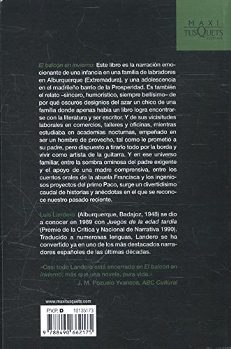 El Balcon En Invierno Luis Landero Duran pdf download - Asomado al balcón, debatiéndose entre la vida que bulle en la calle y la novela que ha empezado a escribir pero que no le satisface, el escritor se ve asaltado por el recuerdo de una conversación que tuvo lugar cincuenta años antes, en otro balcón, con su madre. «Yo tenía dieciséis años, y mi madre cuarenta y siete. Mi padre, con cincuenta, había muerto en mayo, y ahora se abría ante nosotros un futuro incierto pero también prometedor.». Este libro es la narración emocionante de una infancia en una familia de labradores en Alburquerque (Extremadura), y una adolescencia en el madrileño barrio de la Prosperidad. Es también el relato, a veces de una implacable sinceridad, otras chusco y humorístico, de por qué oscuros designios del azar un chico de una familia donde apenas había un libro logra encontrarse con la literatura y ser escritor. Y de sus vicisitudes laborales en comercios, talleres y oficinas, mientras estudia en academias nocturnas, empeñado en ser un hombre de provecho. Pero dispuesto a tirarlo todo por la borda para ser guitarrista, y vivir como artista. Y en ese universo familiar de los descendientes de hojalateros, surge un divertidísimo e inagotable caudal de historias y anécdotas en el que se reconoce la historia reciente.Rang parmi les ventes Amazon: #203164 dans LivresPublié le: 2016-03-08Langue d'origine: EspagnolDimensions: 7.48" h x .67" l x 4.84" L, Reliure: Broché256 pages